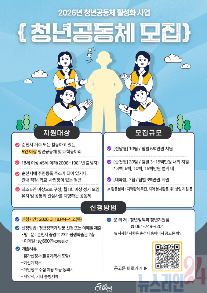 순천시는 청년들의 아이디어와 콘텐츠로 지역 내에서 펼치는 다양한 활동을 지원하는 2026년 「청년공동체 활성화 사업」의 참여 공동체를 모집한다고 밝혔다.
