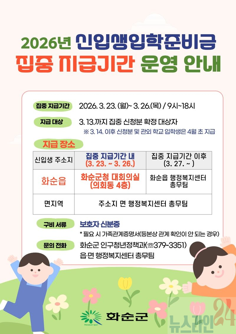 2026년 신입생 입학준비금 집중 지급기간 운영 안내 포스터화순군(군수 구복규)은 2026학년도 초‧중‧고등학교 신입생 가정의 교육비 부담을 덜고 보편적 교육복지를 실현하기 위해 입학준비금을 3월 23일부터 지급한다고 밝혔다.