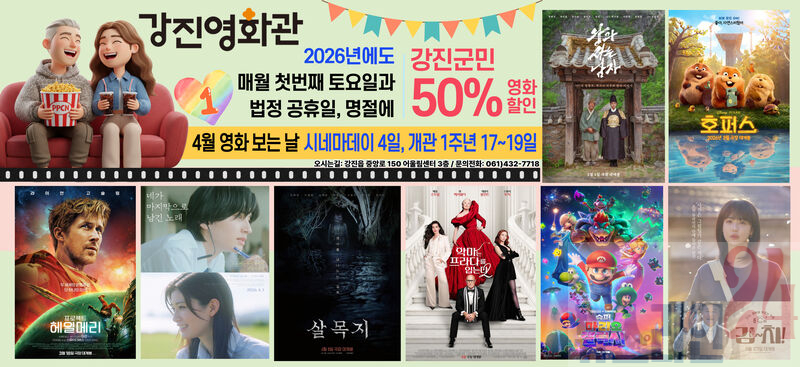 강진영화관 4월 상영작강진영화관이 군민이 더 쉽게 영화를 즐길 수 있도록 운영하는 ‘영화 보는 날’ 행사로 큰 호응을 얻고 있다. 지난해 4월 17일 문을 연 강진영화관은 개관 1주년을 앞둔 올해 3월 22일 기준 누적 관람객 3만 명을 넘어서며 군민들의 꾸준한 관심 속에 지역 문화공간으로 자리잡고 있다.