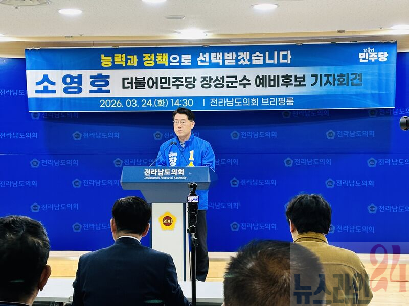 소영호 장성군수 예비후보 기자회견 [이홍석 기자]더불어민주당 장성군수 경선을 앞두고 소영호 예비후보의 피선거권(공천 자격)을 둘러싼 논란이 이어지는 가운데, 소 후보 측이 “이미 당의 공식 검증을 통과했다”며 정면 반박에 나섰다.