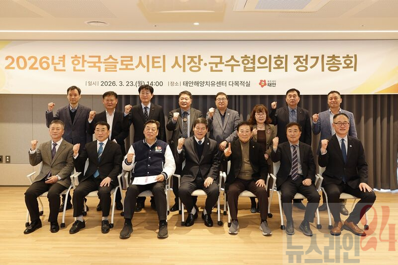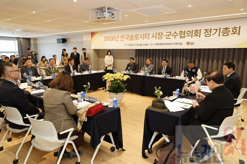 지난 23일, 한국슬로시티 시장·군수협의회 정기총회 기념 촬영 신안군은 지난 23일 태안군 해양치유센터에서 열린 2026년 한국슬로시티 시장·군수협의회 정기총회에 참석했다.
