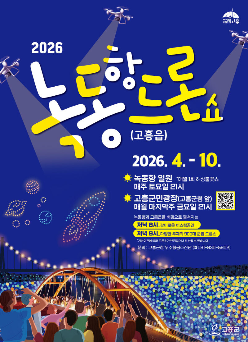 고흥군(군수 공영민)은 오는 4월 4일 토요일 저녁 8시 30분, 녹동항 일원에서 전남 최초의 상설 드론공연이자 고흥군 대표 야간관광 콘텐츠로 자리매김한 ‘녹동항 드론쇼’ 개막식을 개최한다고 밝혔다.