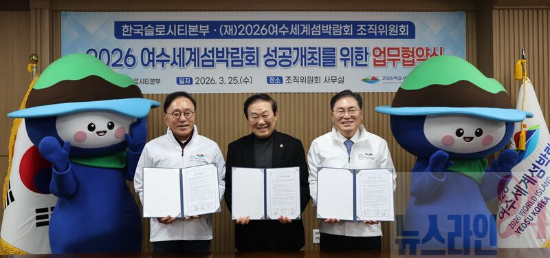 2026여수세계섬박람회 조직위원회(공동위원장 권한대행 여수부시장 정현구(우), 공동위원장 박수관(좌))와 한국슬로시티본부 (국제슬로시티연맹 부회장 겸 한국슬로시티본부 이사장 손대현(중))는 지난 25일 박람회의 성공적 개최를 위해 업무협약(MOU)을 체결했다.2026여수세계섬박람회 조직위원회(공동위원장 권한대행 여수부시장 정현구, 공동위원장 박수관)와 한국슬로시티본부 (국제슬로시티연맹 부회장 겸 한국슬로시티본부 이사장 손대현)는 지난 25일 박람회의 성공적 개최와 지속가능한 섬 발전을 위해 업무협약(MOU)을 체결했다고 밝혔다.