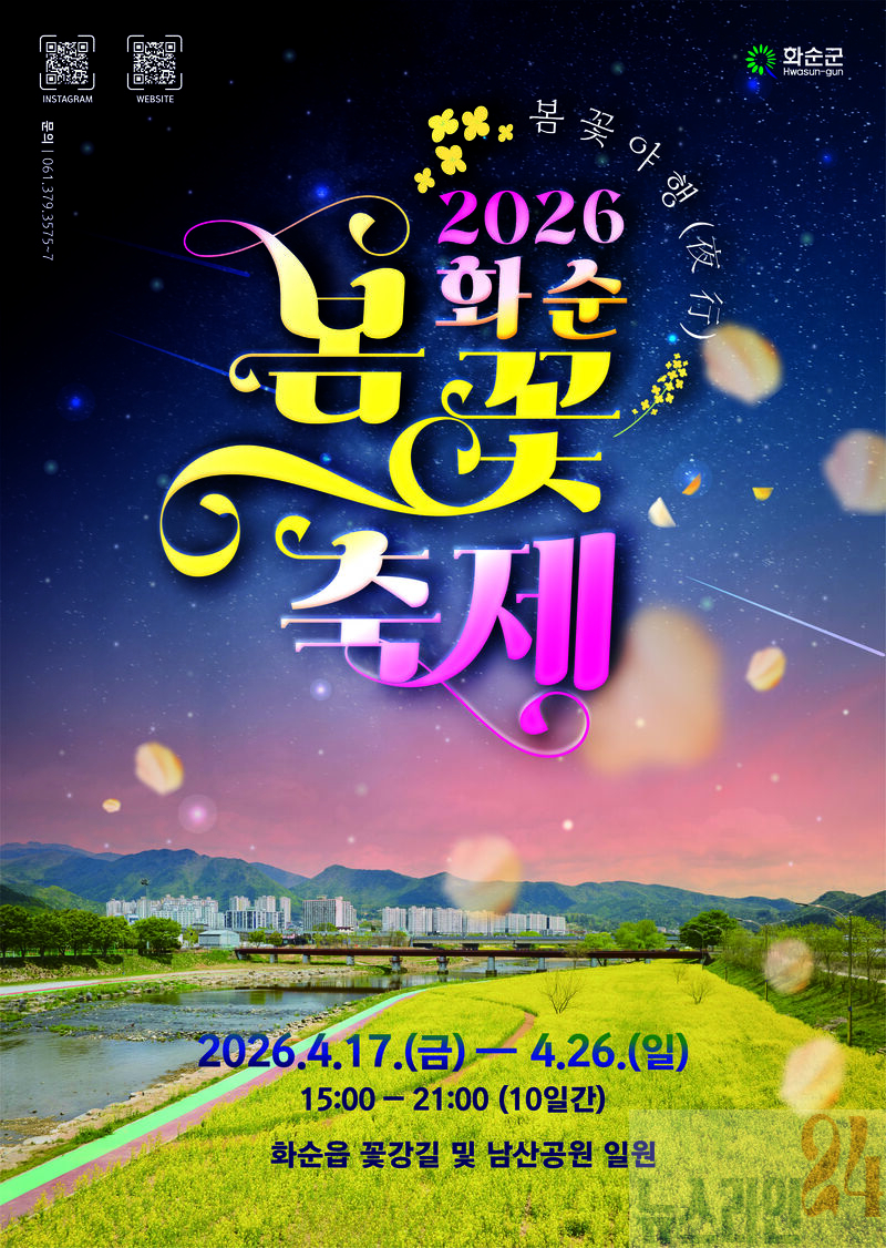 전남 화순군(군수 구복규)은 오는 4월 17일부터 26일까지 화순읍 꽃강길 일원에서 ‘2026 화순 봄꽃 축제’를 개최한다고 밝혔다.
