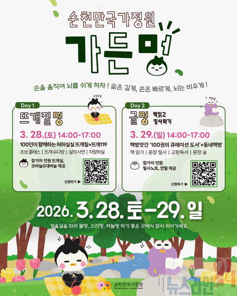 이런 트렌드를 짚은 행사가 이번 주말 순천만국가정원 개울길광장 일원에서 개최된다. 뜨개질과 독서를 멍과 결합한 ‘뜨개멍’과 ‘글멍’이 각각 28일, 29일에 펼쳐진다. 이번 행사는 사전모집 인원 총 200명이 순식간에 마감되었을 정도로 관심이 뜨겁다.