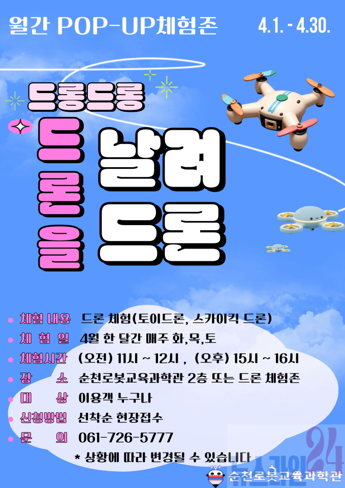 시 관계자는 “체계적인 로봇 교육과 팝업 체험존을 통해 아이들이 로봇·드론과 자연스럽게 친해지고, 미래 과학기술에 대한 호기심을 키우는 계기가 되길 바란다”며 “앞으로도 순천로봇교육과학관의 특성을 살린 다양한 교육·체험 프로그램을 꾸준히 선보이겠다”고 말했다.