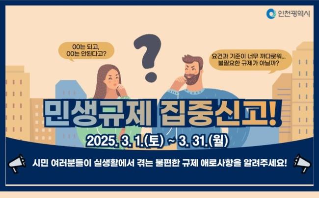 인천광역시(시장 유정복)는 시민이 직접 체감할 수 있는 규제혁신을 추진하기 위해 3월 한 달간 `민생규제 집중신고기간`을 운영한다고 밝혔다.