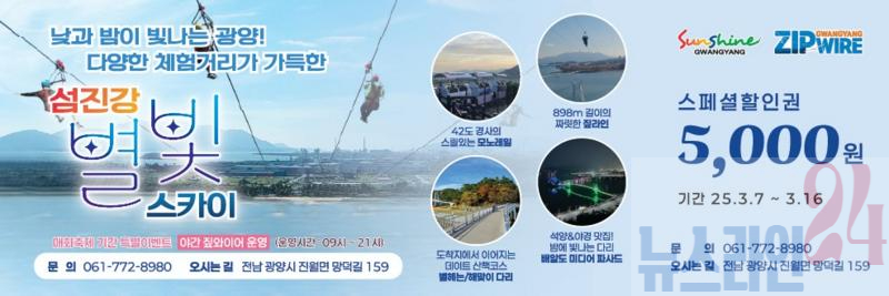 광양시는 짚와이어 ‘섬진강 별빛 스카이’를 제24회 광양매화축제 전 기간동안 야간 개장하고 광양매화축제와 연계해 스페셜 할인 이벤트를 펼친다고 밝혔다.