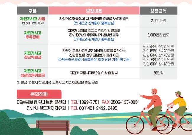 안산시(시장 이민근)는 자전거 관련 사고에 대비해 안산시민(외국인 포함)을 대상으로 자전거 보험에 가입했다고 6일 밝혔다.