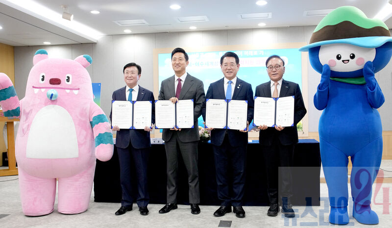김영록 전라남도지사(오른쪽 두 번째)가 7일 서울시청 브리핑룸에서 오세훈 서울시장, 정기명 여수시장, 박수관 조직위원장과 ‘2026여수세계섬박람회조직위-서울시 업무협약‘을 하고 있다.