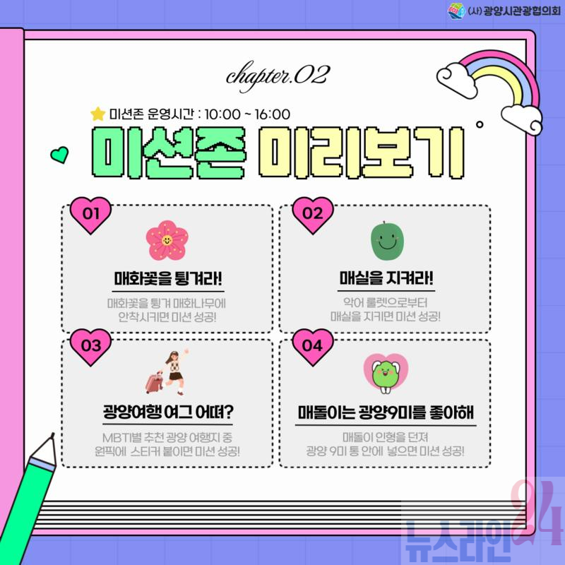 미션존에는 △매화꽃을 튕겨라 △매실을 지켜라 △광양여행여그어뗘? △매돌이는 광양 9미를 좋아해 등의 프로그램이 마련됐으며, 축제 전 기간 매일 오후 4시까지 운영된다.