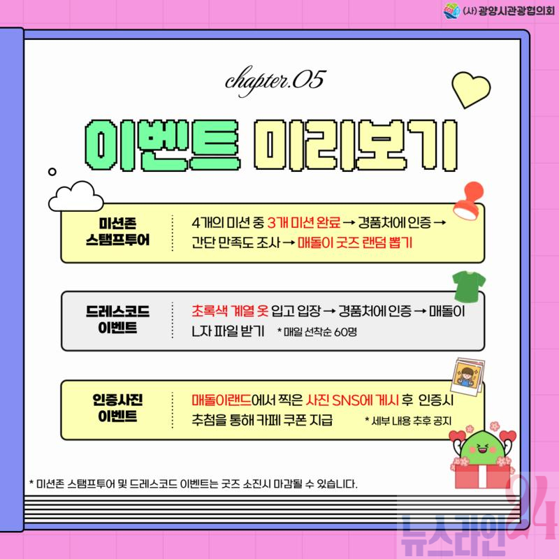 또한, 이를 기반으로 매돌이와 같은 초록색 계열 옷을 입은 입장객을 위한 드레스코드, 인증사진 등 풍성한 경품 이벤트가 방문객을 기다리고 있다.