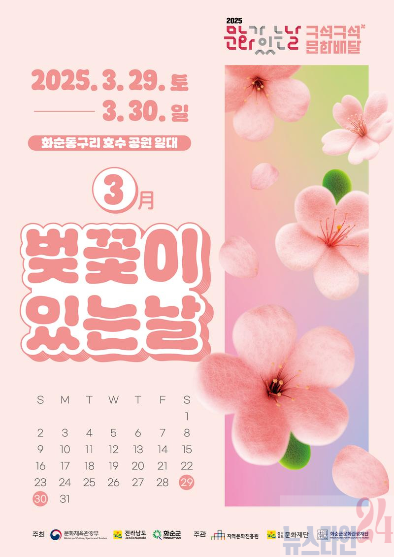 (재)화순군문화관광재단(이사장 구복규)는 오는 29일과 30일 양일간 전남 화순동구리호수공원에서 「벚꽃이 있는 날 Part2」 행사를 기점으로 ‘2025 문화가 있는 날 - 구석구석 문화배달’ 활력촉진형 사업을 시작한다.