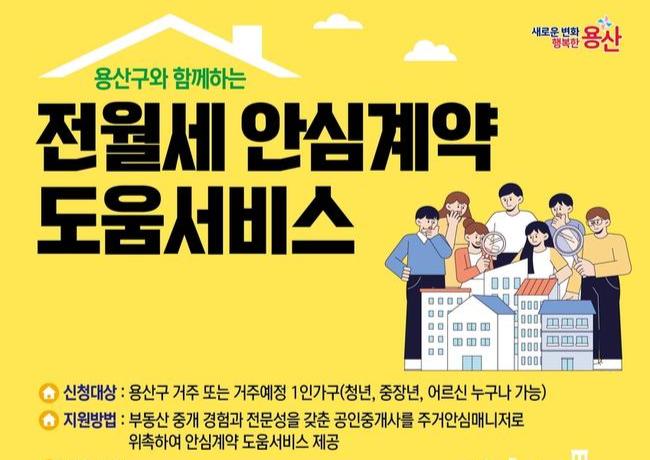 서울 용산구(구청장 박희영)가 부동산 계약에 어려움을 겪는 1인 가구를 지원하기 위해 `1인 가구 전·월세 안심계약 도움서비스`를 확대 운영한다. 이는 부동산 계약 과정에서 발생할 수 있는 각종 피해를 예방하고, 구민들의 안전한 거래를 돕기 위해 추진됐다.