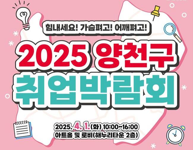 양천구(구청장 이기재)는 일하고 싶은 청년·중장년에게 다양한 취업 기회를 제공하기 위해 `2025 취업박람회`를 다음 달 1일 양천해누리타운 2층에서 개최한다고 25일 밝혔다.