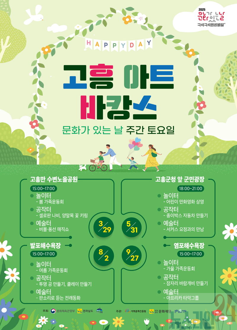 고흥군(군수 공영민)이 지역 간 문화격차 해소를 위해 문화체육관광부에서 주최하고 지역문화진흥원이 주관하는‘2025 문화가 있는 날 구석구석 문화배달’ 공모사업에 2년 연속 선정돼 군민을 위한 다양한 문화행사를 개최한다고 밝혔다.