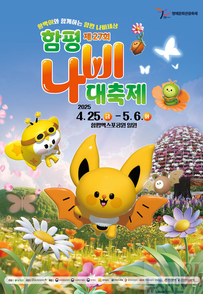 27회 함평나비대축제는 425일부터 56일까지 함평엑스포공원에서 가족과 함께하는 나비 날리기나비‧황박이 팝업스토어나비판타지아 퍼레이드 쇼나비‧슬라임 스퀴시 만들기나비공주‧펫드레스 의상실 체험 등을 선보일 예정이다.