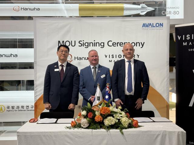 한화시스템과 한화에어로스페이스 호주법인, 비저너리 머신스가 호주 질롱에서 열리고 있는 아발론 에어쇼에서 양해각서(MOU)를 체결했다. 왼쪽부터 박성균 한화시스템 DE1 사업단장, 딘 미치(Dean Michie) 한화에어로스페이스 호주법인장 대행, 소니 포스터(Sonny Foster) 비저너리 머신스 CEO