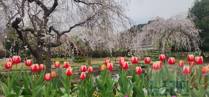 수양벚꽃이 하늘거리는 농업기술센터 시험포장 내에서는 라넌큘러스, 튤립, 비올라 등 15종의 형형색색 향긋한 봄꽃을 내달 20일까지 집중 전시한다.