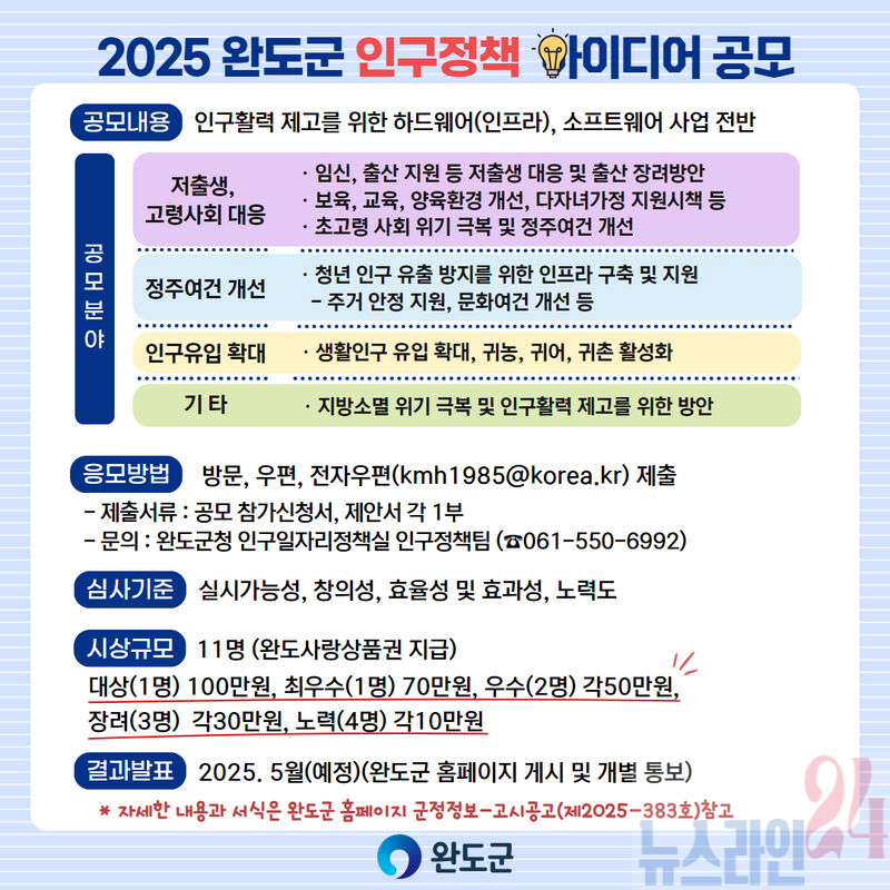 완도군이 ‘2025 인구정책 아이디어 공모전’ 기간을 연장한다.
