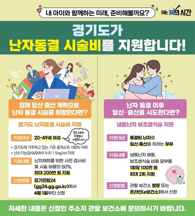 `경기도 난자동결 시술비 지원` 사업은 장래 임신·출산 계획이 있어 가임력 보존을 희망하는 20∼49세 여성에게 난자채취를 위한 사전 검사비 및 시술비용의 50%, 최대 200만 원까지 생애 1회 지원한다.