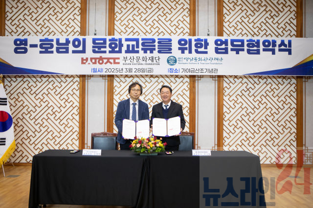 (재)영암문화관광재단<대표이사 전고필>이 지난 28일 영암군 가야금산조기념관에서 (재)부산문화재단<대표이사 오재환>과 (이하‘두 기관’) ‘영-호남의 문화교류’를 위한 상호협력을 위한 협약식을 진행했다고 밝혔다.