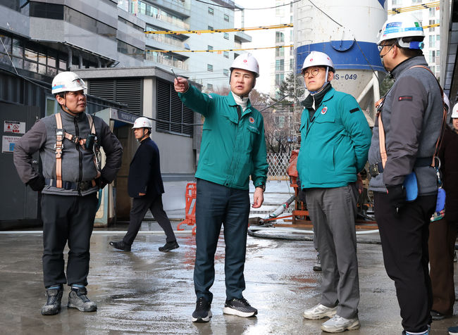 오언석 도봉구청장(가운데)이 지난 3월 4일 지역 내 한 건축 공사장에서 현장 관계자에게 안전관리 조치를 지시하고 있다(2025. 3. 4.)