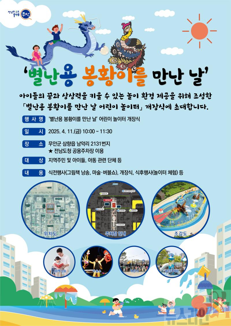 전남 무안군(군수 김산)은 오는 11일 오전 10시부터 남악 중앙공원(삼향읍 남악리 2131번지)에서 물놀이시설이 포함된 어린이 놀이터 개장식을 개최한다.