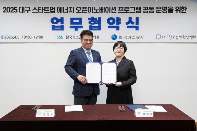 한국가스공사(사장 최연혜)는 4월 3일 대구 본사에서 대구창조경제혁신센터(대표이사 한인국)와 `에너지 오픈이노베이션 지원 사업 업무 협약`을 체결했다고 4일 밝혔다.