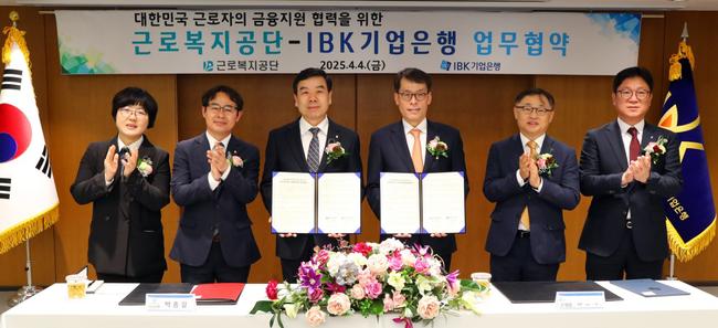 지난 4일, 박종길 근로복지공단 이사장(가운데 왼쪽)과 김성태 IBK기업은행장(가운데 오른쪽)이 IBK기업은행 본점에서 대한민국 근로자의 금융지원 협력을 위한 업무협약을 체결하였다.
