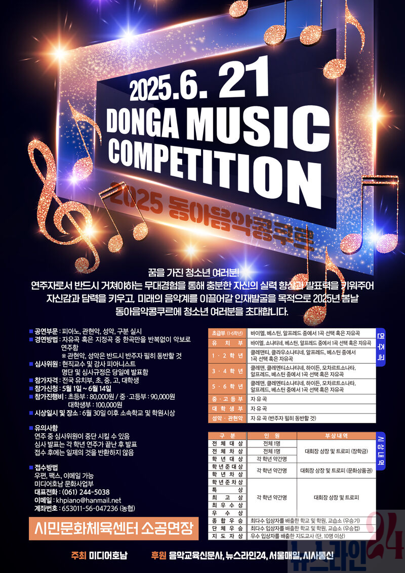 미디어 호남이 주최하는 2025동아음악콩쿠르가 오는 6월 21일 목포시민문화체육센터 소공연장에서 개최 될 에정이다.