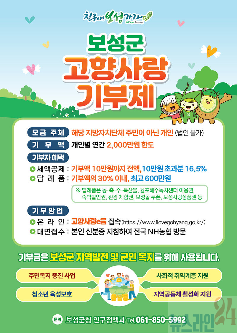 한편, 고향사랑기부제는 개인이 관할 주소지를 제외한 지방자치단체에 고향사랑e음(https://www.ilovegohyang.go.kr)과 농협 영업점을 통해 일정 금액을 기부하면 세액공제와 답례품(기부액 기준 최대 30%) 혜택을 받을 수 있다.
