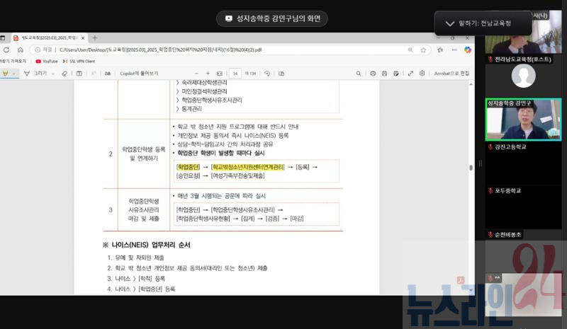 전라남도교육청(교육감 김대중)이 4월 3일부터 4일까지‘학업중단예방 나이스(NEIS) 지원 시스템’온라인 연수를 실시했다.