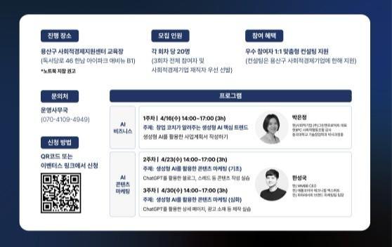 서울 용산구(구청장 박희영)가 사회적경제기업의 디지털 전환을 지원하기 위해 인공지능(AI) 기반의 실무형 마케팅 교육프로그램을 마련했다. 구는 오는 4월 16일부터 30일까지 총 3회에 걸쳐 `3일 만에 끝내는 AI 비즈니스, 마케팅 정복하기` 교육을 실시한다.