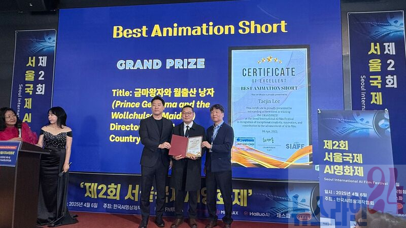영암군의 설화를 바탕으로 제작된 애니메이션 <금마 왕자와 월출산 낭자>가 6일 서울 앙트레블에서 열린 ‘제2회 서울국제AI영화제’에서 단편 애니메이션(Best Animation Short) 부문 대상을 차지했다.