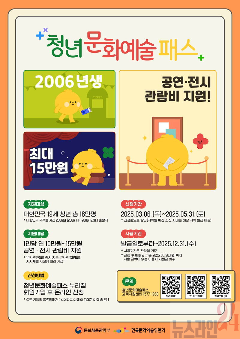 신청은 오는 5월 31일까지 청년 문화예술패스 누리집(youthculturepass.or.kr)을 통해 소득과 관계없이 올해 19세가 되는 2006년생 청년이라면 누구나 신청할 수 있다.