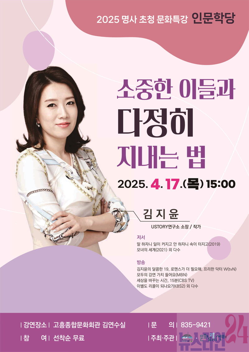 고흥군(군수 공영민)과 고흥군 문화도시센터(센터장 서성훈)는 오는 4월 17일 목요일 오후 3시, 고흥문화회관 김연수실에서 김지윤 소장을 초청해 ‘소중한 이들과 다정히 지내는 법’을 주제로 강연을 개최한다.