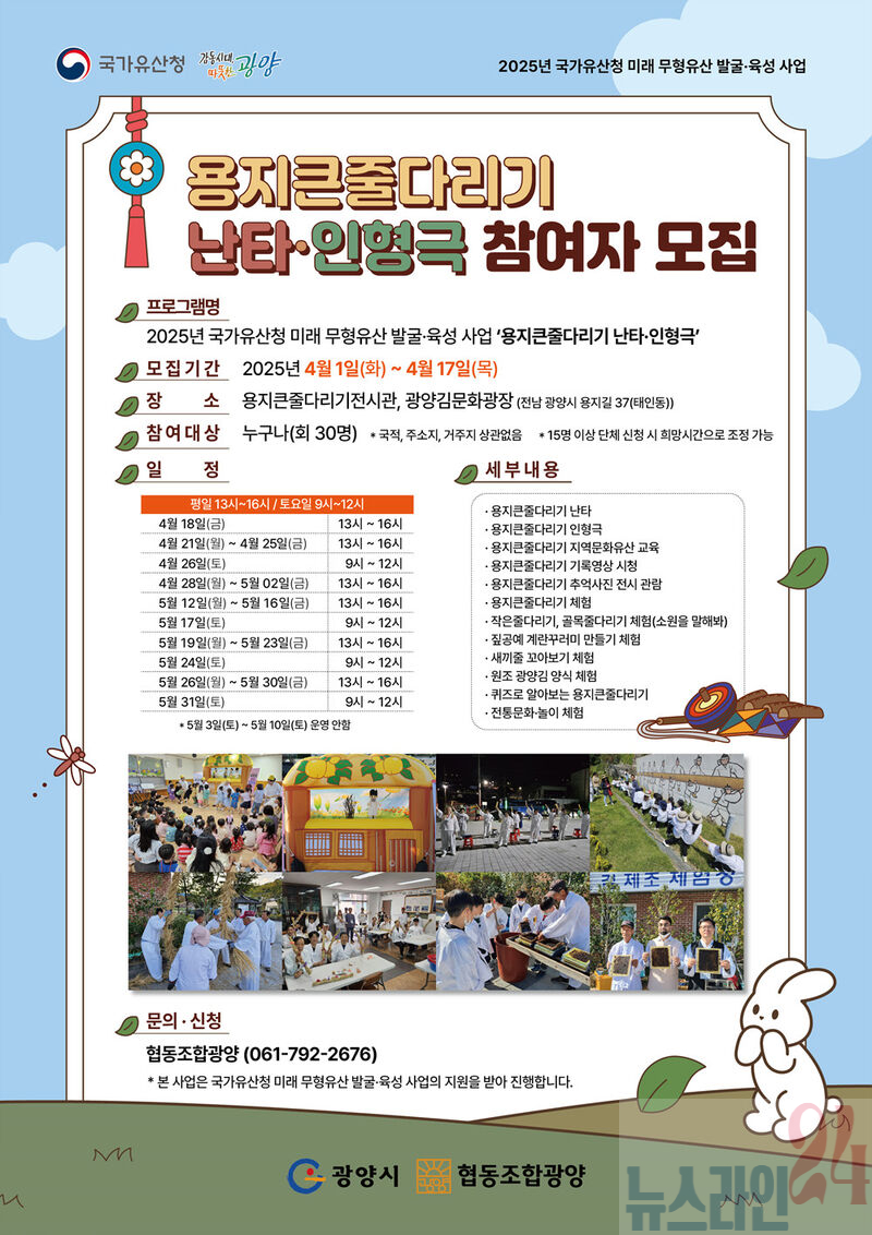 광양시가 오는 17일까지 2025년 국가유산청 미래 무형유산 발굴·육성 사업 ‘김 풍작 소원 비세_용지큰줄다리기’의 첫 번째 프로그램인 ‘용지큰줄다리기 난타·인형극’ 참여자를 모집한다.