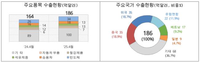 관세청이 4월 11일 발표한 ‘2025년 4월 1일~10일 수출입 현황’에 따르면, 수출은 186억 달러로 전년 동기 대비 13.7% 증가했고, 수입은 197억 달러로 6.5% 늘어나 무역수지는 11억 달러 적자를 기록했다.
