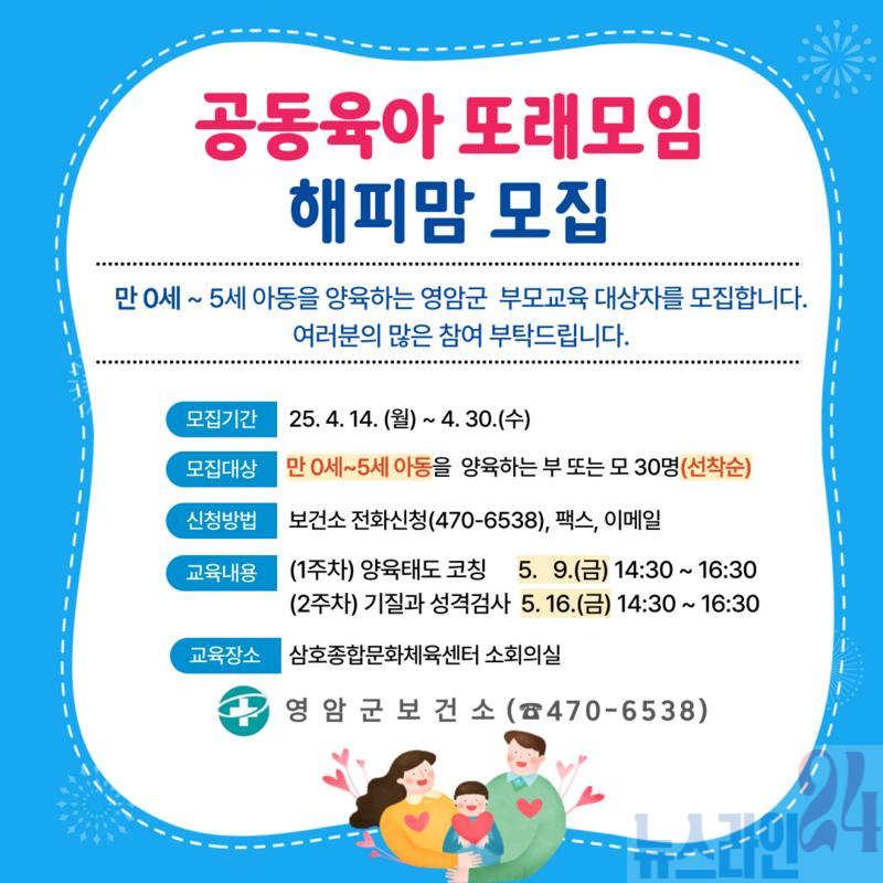 공동육아 또래 모임 해피맘에는 0~5세 자녀를 둔 엄마나 아빠 30명이 선착순으로 참여할 수 있고, 신청은 영암군보건소 전화(061-470-6538)로 하면 된다.