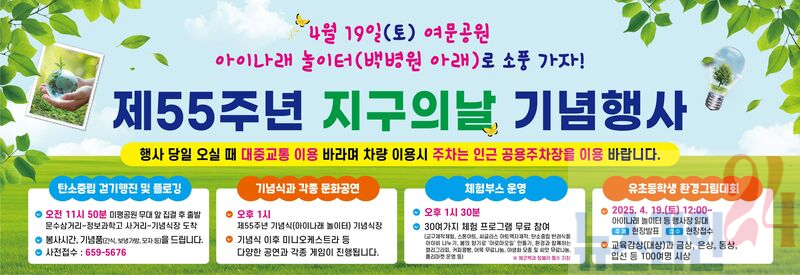 마지막 날인 19일에는 ‘제55주년 지구의 날’을 기념해 탄소중립 시민행동 걷기 행진과 플로깅활동을 시작으로 오후 1시부터 여문 문화의 거리 일대에서 기념식이 열린다. 특히 ‘어린이 환경그림그리기 대회’를 개최해 어린이들의 참여를 이끌어 낼 예정이다.