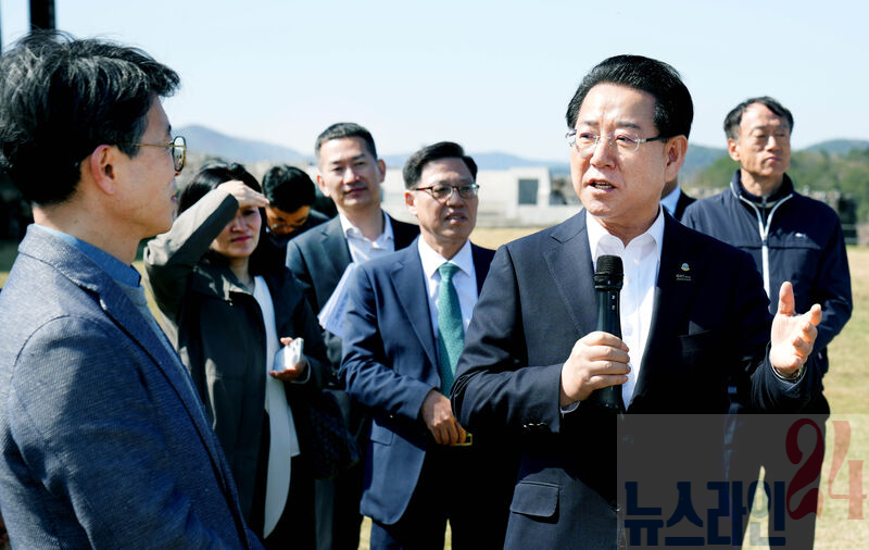 화순 적벽 상수원보호구역 개발을 위한 상수원관리규칙 개정과 관련하여 김완섭 환경부 장관이 15일 화순 적벽 일원을 방문한 가운데 김영록 전라남도지사가 관련사항에 대해 논의하고 있다.