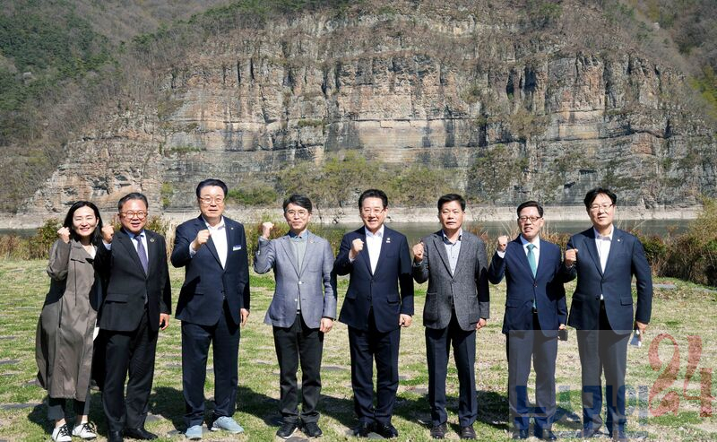 화순 적벽 상수원보호구역 개발을 위한 상수원관리규칙 개정과 관련하여 김완섭 환경부 장관이 15일 화순 적벽 일원을 방문한 가운데 김영록 전라남도지사가 참석자들과 기념촬영을 하고 있다.