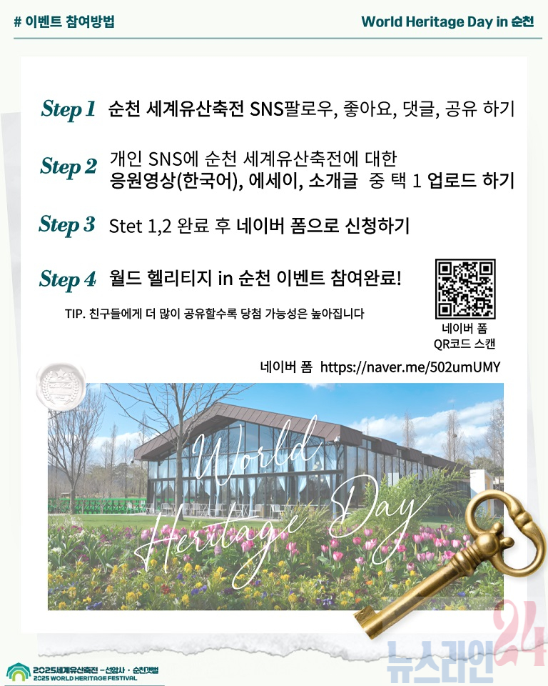 신청자는 ‘순천세계유산축전’ SNS 채널을 팔로우하고 해당 게시글을 좋아요, 댓글, 공유해야 한다. 이후 개인 SNS 채널에 ‘순천세계유산축전 한국말 응원 영상’, ‘참여 희망 에세이’, ‘순천 세계유산 소개’ 중 하나를 골라 게시하고 네이버 폼으로 인증하면 된다.
