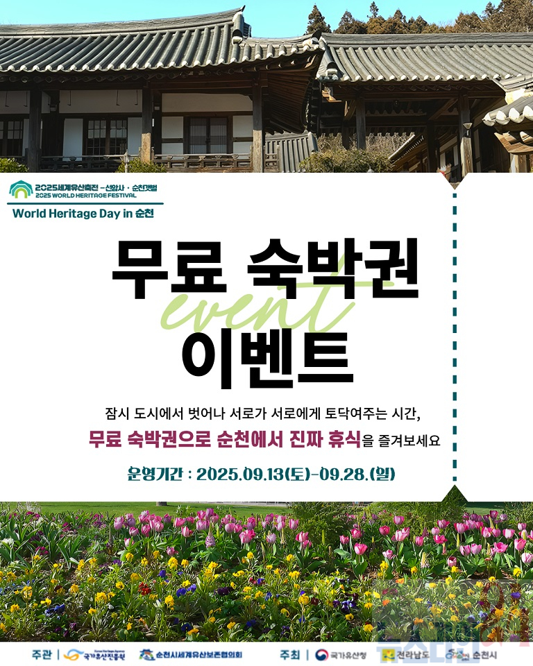 순천시 세계유산보존협의회(위원장 김준선)는 오는 30일까지 순천 1박 2일 숙박권을 제공하는 이벤트를 개최한다.