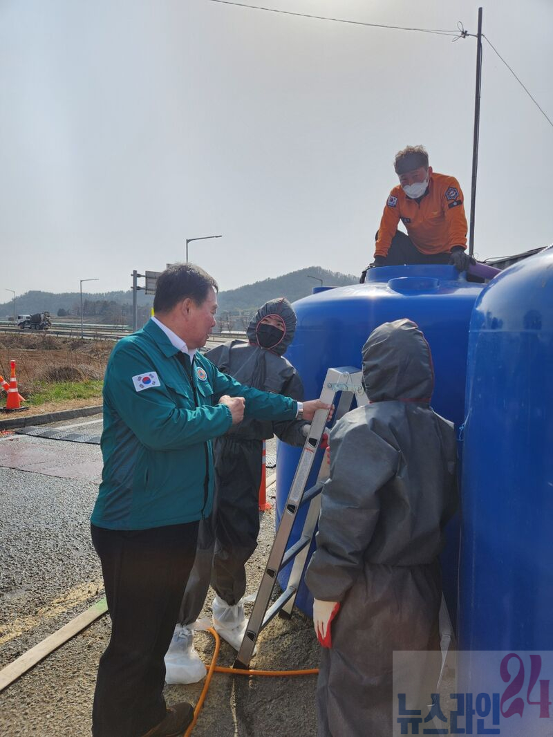 군은 즉시 발생농장과 주요 도로에 통제초소를 9개소로 확대 운영하고, 드론 공동방제단과 제설차량까지 투입해 방역대 집중 방역을 실시하고 있다.