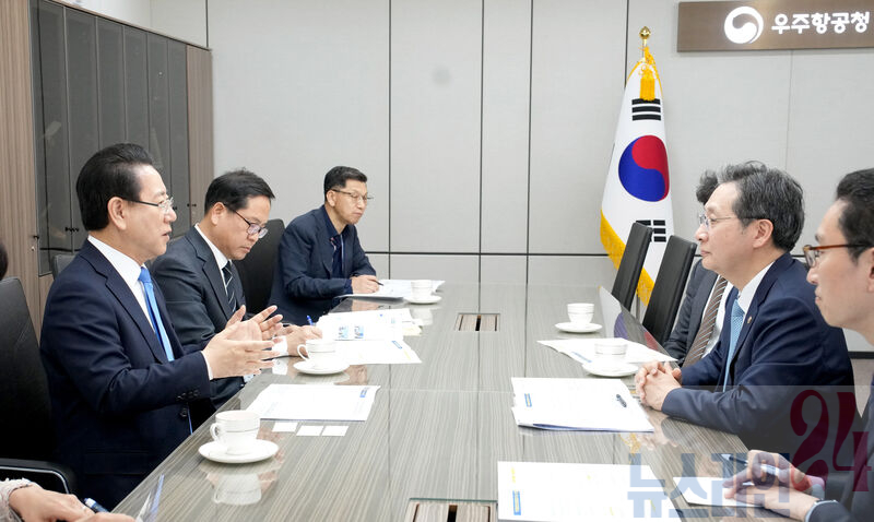 김영록 전라남도지사가 16일 오후 경남 사천 우주항공청을 방문, 윤영빈 우주항공청장과 면담을 갖고 ‘제2우주센터 고흥 나로우주센터 인근 유치’ 및 ‘사이언스 컴플렉스 예비타당성조사 대상 사업 선정 협력’ 등 전남도 우주발사체 산업 클러스트 구축 상호협력을 위한 논의를 하고 있다.