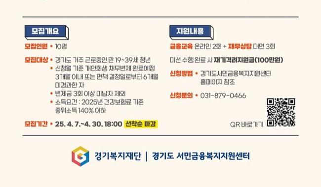 신청은 경기도 서민금융복지센터 누리집 공지사항 내 QR코드 링크를 통해 가능하며, 최종 선정자는 오는 5월 26일 개별 문자 및 누리집 공지를 통해 안내한다. 자세한 문의는 경기도서민금융복지지원센터(031-879-0466)로 하면 된다.