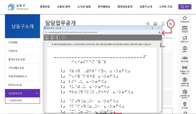 인천시 남동구는 이달부터 인천 지자체 중 처음으로 구 홈페이지 내 시각장애인을 위한 전자점자 서비스를 운영한다고 18일 밝혔다.