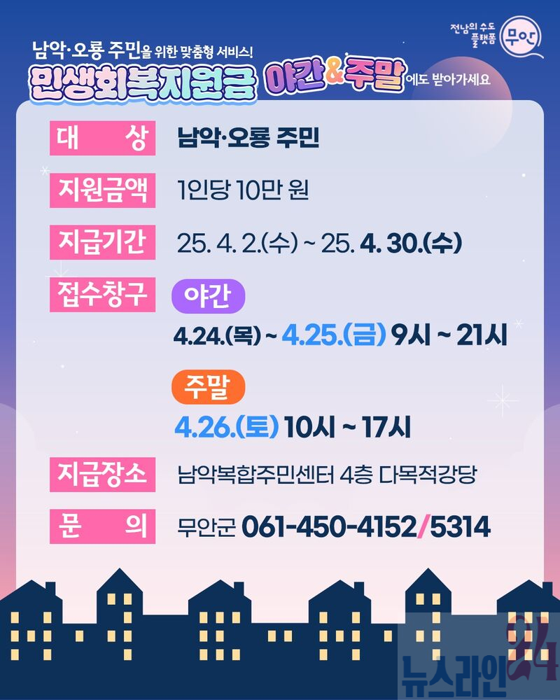 전남 무안군(군수 김산)은 지역경제 회복의 마중물 역할을 하고 있는 전 군민 1인당 10만원의 ‘민생회복지원금’을 보다 편리하게 수령할 수 있도,록 남악·오룡 주민 대상으로 야간·주말 특별지급 창구를 운영한다.